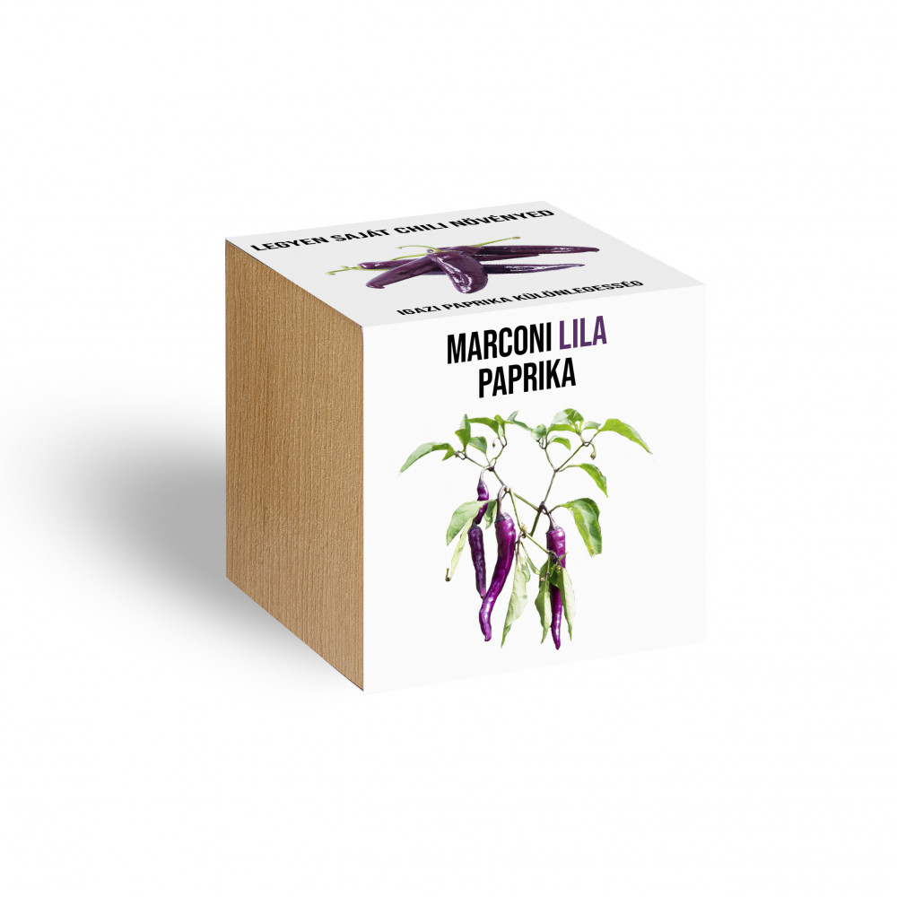 A szett két nevelésre alkalmas!A csomag tartalma: - 1 db fa kocka kaspó - 2 db tőzegkapszula, mely 2 nevelésre alkalmas - 4-5 db lila marconi chili paprika magA kocka anyaga: Bükk A kocka mérete: 7.5 cm X 7.5 cm X 7.5 cm Lehetőleg tartsd a növényt fényes, meleg helyen és öntözd rendszeresen alulról, hogy ne száradjon ki az ültetőközeg. A tőzegkapszulát a növénnyel együtt ültetheted át, a talajban teljesen lebomlik. Kérlek, ügyelj a gondozási útmutatóban leírtak betartására, hiszen a magok csak a megfelelő körülmények biztosítása mellett csíráznak sikeresen.Gondozási útmutató: Öntsünk vizet a Kocka mélyedésébe, majd helyezzük bele a tőzegkapszulát úgy, hogy a lukas oldala legyen felfelé. Addig pótoljuk alá a vizet, amíg teljesen meg nem dagad. Bontsuk ki a magokat tartalmazó tasakot, majd helyezzünk egy, vagy legfeljebb két magot a tőzegkapszula mélyedésébe. Ezt követően csak arra kell ügyelnünk, hogy az ültetőközeg mindig nedves maradjon, és biztosítsuk a magoknak a megfelelő csírázási hőmérsékletet (20-25C). Csírázási idő: 1-2 hét. Miután a magok kikeltek, tartsuk a növényt világos helyen. Átültetése 4-6 leveles állapotban esedékes nagyobb cserépbe, tápdús talajba.