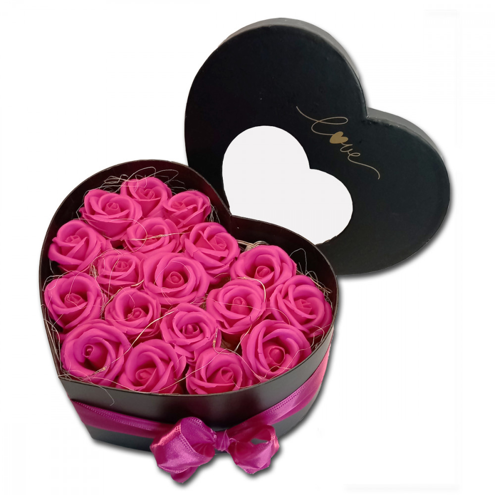 Szappanrózsa szívbox, ablakos rózsadoboz - pink - L + led világítással
