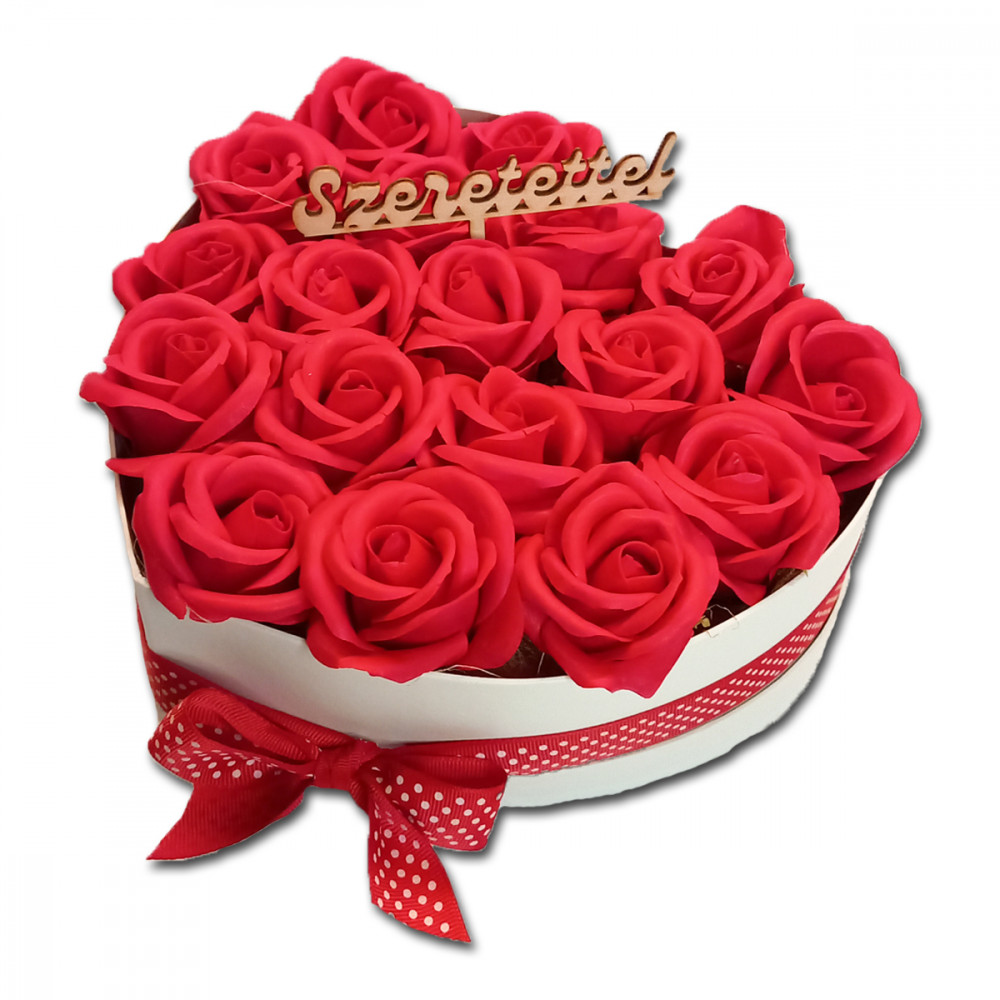 Szappanrózsa szívbox, fehér rózsadoboz - piros- M